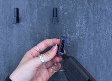 Klebt die Haken mit Heißkleber nebeneinander unter den Spruch und lasst den Kleber anschließend vollständig trocknen.