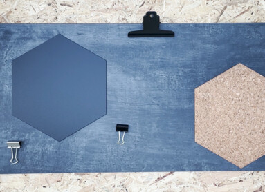 Schneidet die beschreibbare Platte sowie die Korkplatte in die gewünschte Form zu. Legt anschließend die Platten und Klammern so zurecht, wie ihr sie später anordnen möchtet. Danach klebt ihr alles mit Heißkleber und/oder doppelseitigem Klebeband fest.