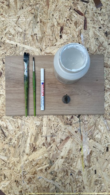 - Werkzeug: Säge, Zollstock oder Lineal, Bleistift, Pinsel, Heißkleber, Permanentmarker