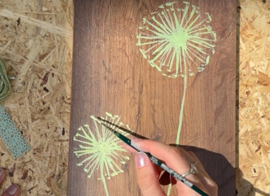 Malt anschließend im unteren Bereich zwei Pusteblumen: zuerst mit hellgrüner Farbe, danach setzt mit weißer Farbe Highlights. Lasst dabei ruhig ein paar Fallschirmchen davonfliegen.