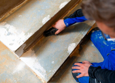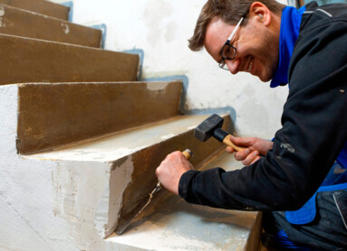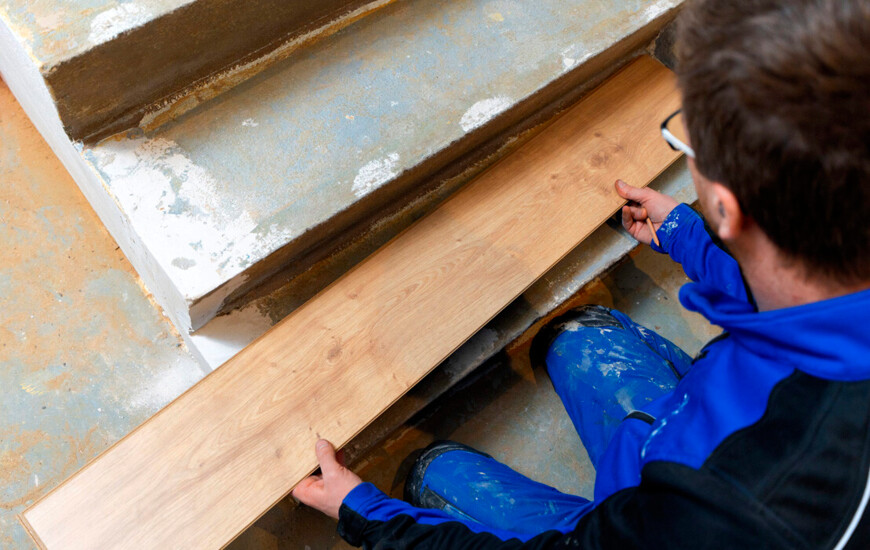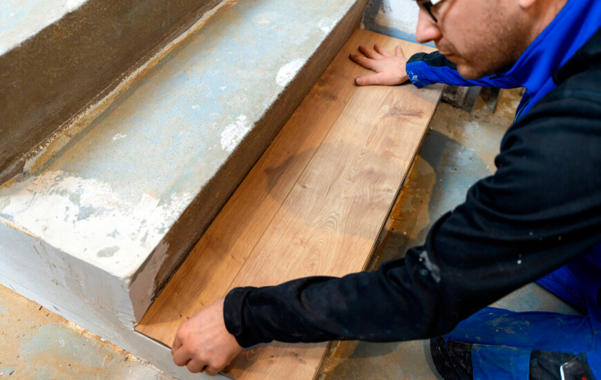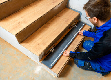 Bevor Sie das Laminat verlegen, entfernen Sie Unebenheiten an den Stoß- und Trittseiten der Treppen. Glätten Sie verspachtelte Stellen und Eckbereiche.