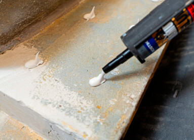 Versiegeln Sie die Eckbereiche zwischen Tritt- und Setzstufe abschließend mit elastischem Dichtstoff. Tragen Sie den Dichtstoff gleichmäßig auf, besprühen Sie ihn mit Spülmittellösung und ziehen ihn dann glatt ab.