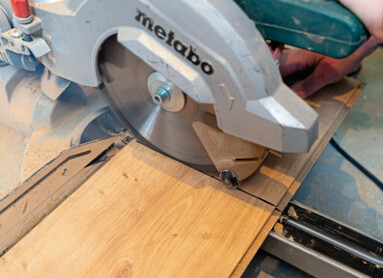 Zum Bekleben der Setzstufe nehmen Sie zuerst den Winkel ab, um die Stoßseite zu begradigen.